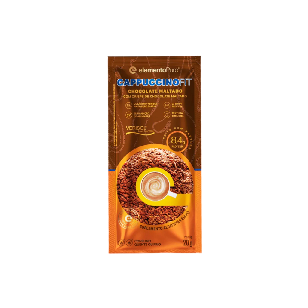 Além das propriedades nutricionais que o whey protein e o colágeno fornecem ao seu organismo, no CAPPUCCINO FIT elementoPuro® você encontrará a harmonia de ingredientes que o torna cremoso na medida certa, com uma textura aveludada voltada para os fãs de uma das bebidas mais famosas do mundo. Consuma quente ou frio e sinta o sabor do verdadeiro cappuccino.