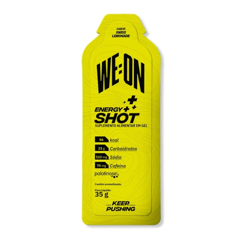 O WeOn® Energy Shot de limonada suíça foi projetado para atividades de alta intensidade e longa duração, com alta carga calórica (energia por mais tempo), eletrólitos (reposição de sais), cafeína (maior foco) e um sabor refrescante!